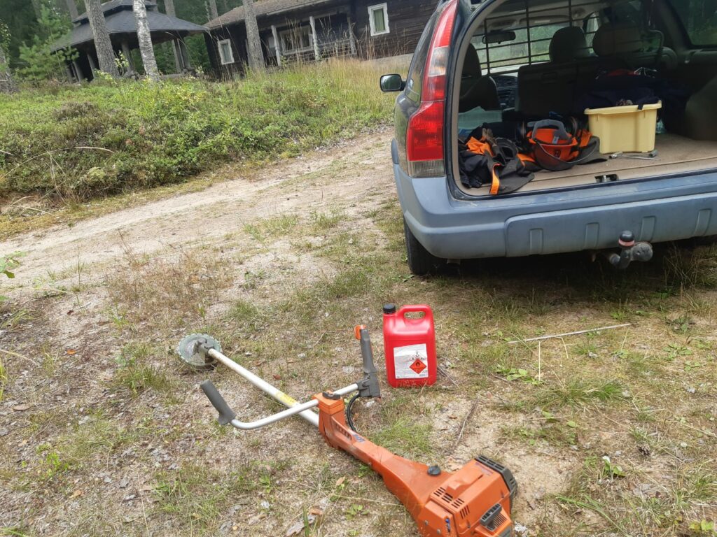 Radalle päätettiin myös hankkia grillikatos yhteiseksi taukopaikaksi toimijoille ja ampujille niin hankkeen aikana, kuin vuosiksi eteenkin päin. Alkuun tutkittiin tarjolla olevia uusia ns. kevythirsikatosvaihtoehtoja, mutta katokseksi lopulta valikoitui käytetty hieman ehostusta vaativa pyöröhirsi katos, jollainen tuli yllättäen tarjolle kohtuu hintaan ja jonka katsottiin olevan juuri sopiva ympäristöön ja tarjoavan hyvän suojan hieman isommallekin porukalle. Kierrätysteemalla siis mentiin lopulta tämänkin osalta.